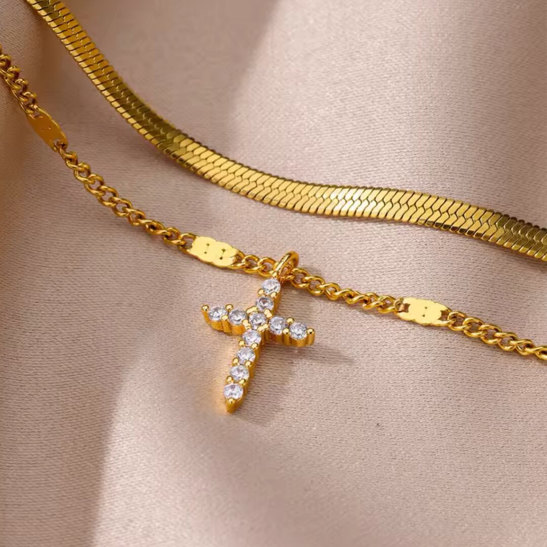 デザイン性の高い、ジルコニアのクロスが輝く二連アンクレット。