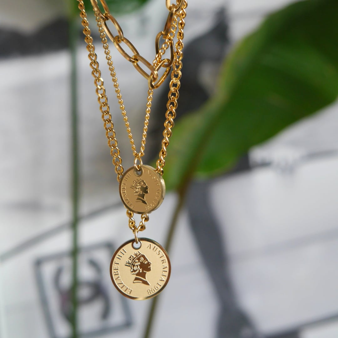 エリザベスコイン×スクエアチェーン 3連ネックレス【Stainless steal】